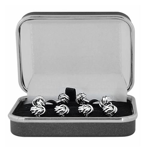 紐を編み込んだようなデザインのノットカフスとスタッズボタンのセット。