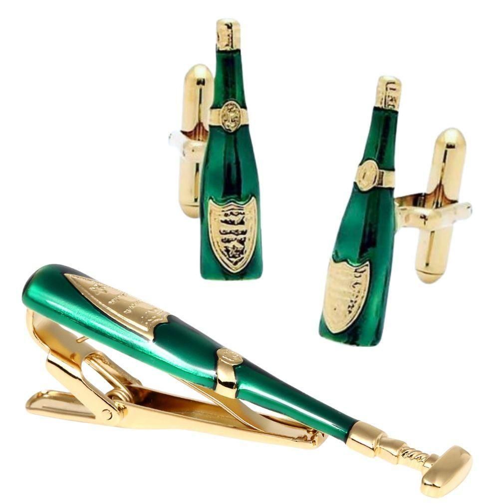 ワインボトルをモチーフにしたカフスとネクタイピンのセット。